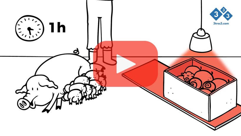 - Recolhemos os leitões recém-nascidos e úmidos e os colocamos imediatamente no escamoteador com uma fonte de calor e pó secante (também podemos secá-los antes) Idealmente, ao colocar no escamoteador, marcamos no dorso com um giz colorido.
