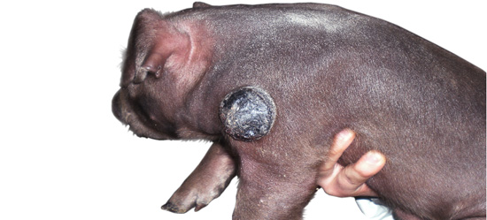 Este problema caracteriza-se pela ausência congênita de epiderme ou epitélio mucosal, com mais frequência nas extremidades posteriores e na cavidade oral. Em algumas ocasiões também se conhece como ‘aplasia cutis’. Os suínos afetados podem morrer dependendo da severidade e/ou da localização da falta de pele.