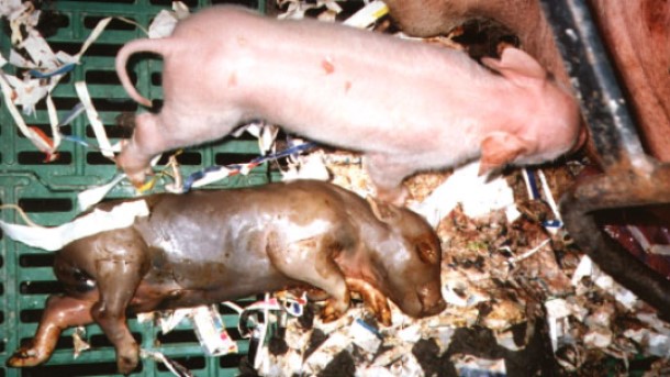 O único sinal clínico bem estabelecido de infecção por PVS é falha reprodutiva na fêmea. Em porcas e marrãs, o sinal importante é a presença de mumificados. No início da gestação, a infecção pode levar à morte embrionária seguida de reabsorção de fluidos e tecidos moles. A partir do dia 35, pode ocorrer a mumificação do feto morto. Aos 70 dias de gestação, os fetos já apresentam algum desenvolvimento do sistema imunológico e podem resistir à infecção pelo vírus. Em leitegadas infectadas, é comum que nem todos os fetos sejam afetados da mesma forma. Muitas vezes vimos mumificação em apenas alguns fetos e outros na leitegada conseguem sobreviver. Ver leitegadas que vêm de marrãs, nas quais existem alguns mumificados, junto com leitões mortos e leitões vivos saudáveis, é a grande marca registrada do parvovírus suíno.