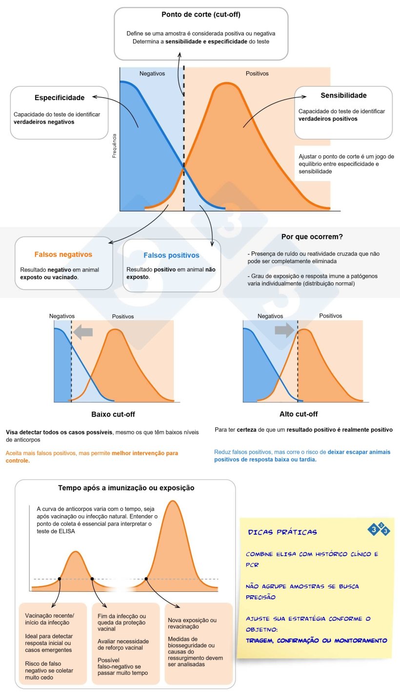 O ponto de corte (cut-off) em testes ELISA influencia diretamente a sensibilidade e a especificidade do diagnóstico. Decidir por um cut-off mais alto ou mais baixo envolve um equilíbrio e impacta diretamente na detecção de animais positivos ou negativos, influenciando diagnósticos, estratégias de controle sanitário e medidas de biosseguridade.