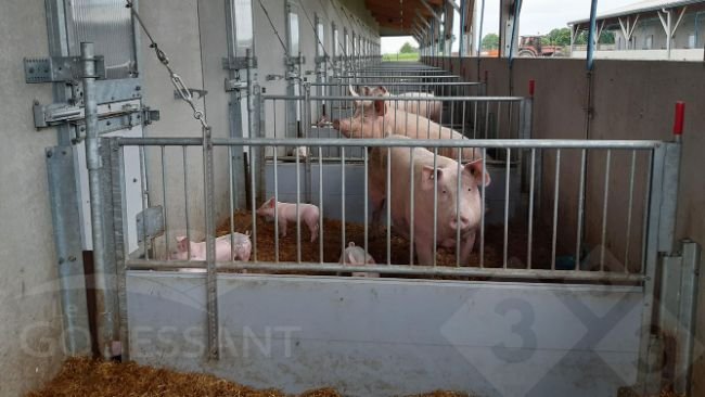 Internamente são muito normais, logicamente damos mais espaço (1,25 m²/cabeça) e constantemente temos palha em cada baia, oferecida através de dispensador de palha (fotos 6 e 7). Todas as salas (incluindo as dos leitões pequenos) são de parede simples, com uma altura máxima de 6 metros, o que melhora muito a ventilação e faz com que os animais não se sujem para se refrescar no verão. O piso compacto é altamente isolado por dentro e com ripas por fora, que serve como área de defecação. A parede sul também é muito isolada (todas as baias têm orientação leste-oeste).