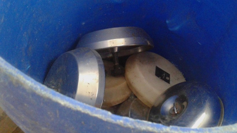 Uma maneira simples, rápida e fácil de lavar esses pequenos comedouros é mergulhá-los em um grande tambor de 200 litros. Para preparar o tambor, a tampa superior é cortada deixando uma grande abertura para facilitar a inserção de comedouros sujos. Enche-se com água e coloca-se o sabão que usamos para limpar as baias e gaiolas, um copo de sabão para 200 litros de água. Deixe-os de molho por algumas horas e depois enxágue bem com água limpa e eles estarão prontos para o próximo uso.