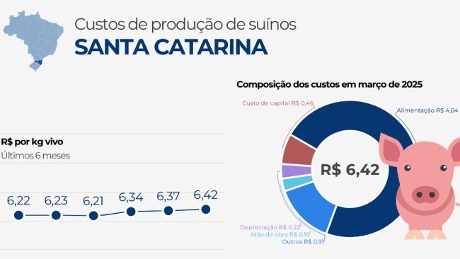 O custo de produção do quilo de suíno vivo em Santa Catarina subiu para R$ 6,42 em março, com alta acumulada de 14,31% nos últimos 12 meses. A ração representa 72,29% dos custos e segue como principal componente. Os índices da Embrapa servem de referência para produtores acompanharem a evolução dos custos e apoiarem decisões estratégicas.