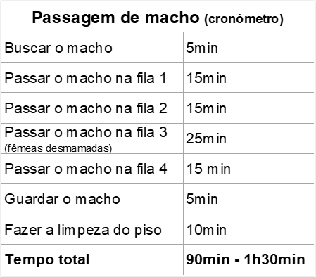 Como método para ter a previsão mais ajustada do tempo de tarefas ligadas aos manejos com os animais, propõe-se que o colaborador ou equipe seja assistida em sua tarefa, cronometrando desde o início até a completa execução.