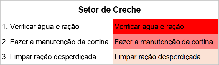 Propõe-se fazer destaques visuais para a classificação das atividades, podendo, por exemplo, ser numérico ou por cor, conforme abaixo: