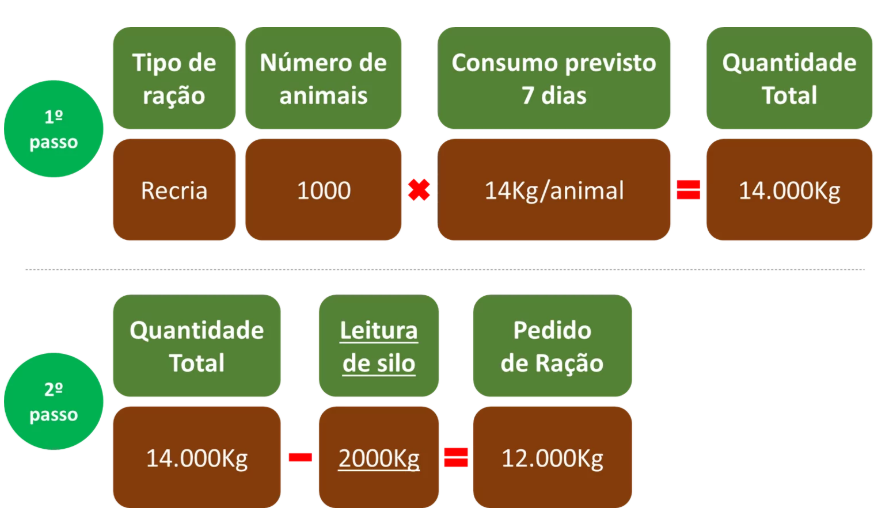 A confecção do pedido de ração deve conter informações obtidas por meio do cálculo baseado na leitura de silo, quantidade de animais e consumo previsto; além do tipo de ração requerida.