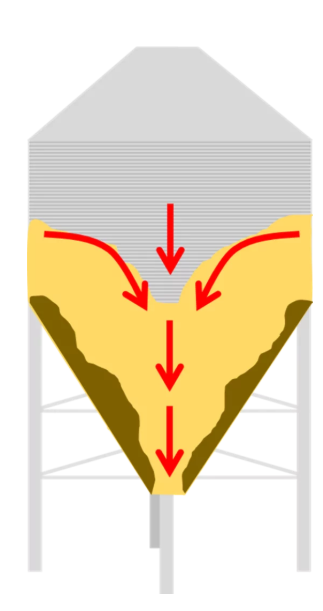 o movimento de descida da ração no silo, conforme exposto na imagem abaixo, impede rações que ficam na “parede” do funil de descerem, podendo demorar dias ou semanas para serem fornecidas aos animais.