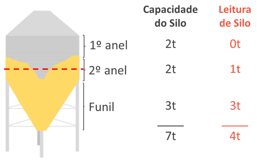 O silo é composto pelo funil e por anéis. Essas partes têm diferentes capacidades de armazenamento a depender das dimensões. Abaixo está apresentada uma ilustração exemplo a fim de orientar a leitura de silo:
