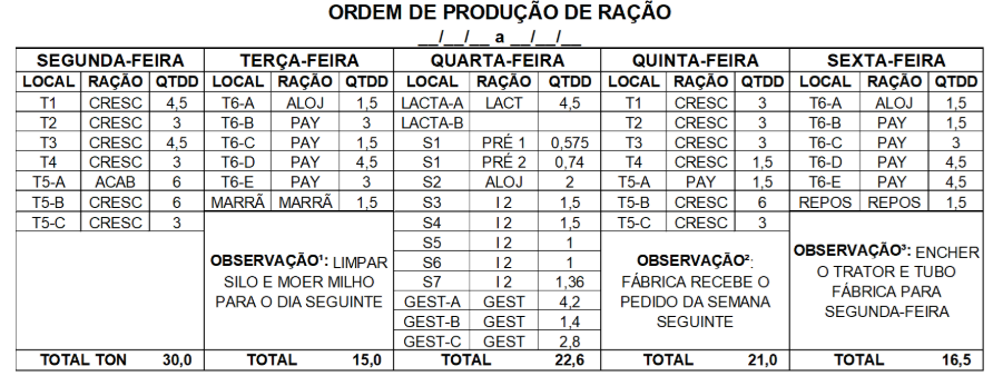 Segue abaixo um modelo de Ordem de Produção de Ração. Nota-se que é adequado conter informações com o local onde a ração será descarregada, tipo de ração, quantidade e observações gerais como: limpeza, troca de ingredientes, dia de receber o pedido de rações, entre outros.