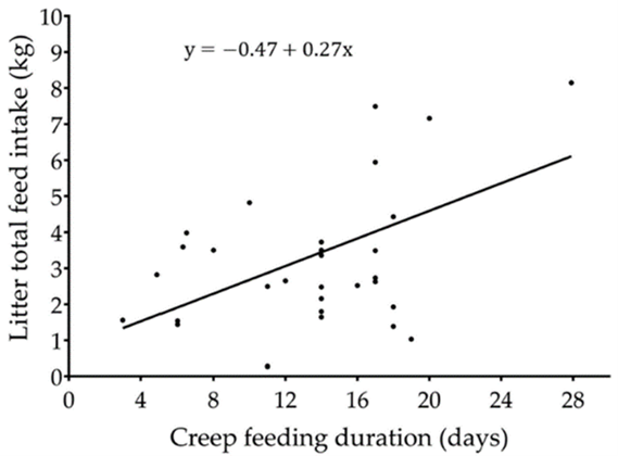 O elemento mais relevante versa sobre a duração do uso de creep feeding durante a lactação. Em uma metanálise que buscou elucidar os efeitos do uso de creep feeding durante o pré e pós-desmame, Muro et al. (2023) verificaram que, além da importância do fornecimento, é fundamental atentar-se à exposição dos leitões precocemente à ração. Os autores encontraram relação positiva entre duração do uso de creep feeding e consumo total da ração pela leitegada, na ordem de 0,27 kg de ração para cada dia de fornecimento extra (p < 0,001; Figura 2).