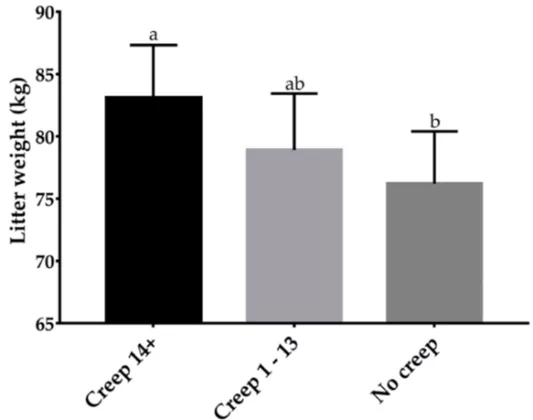 Os mesmos autores identificaram que leitegadas que consumiram creep feeding por até 13 dias apresentaram peso ao desmame 4,3% maior que leitegadas que não consumiram ração, ao passo que leitegadas que consumiram creep feeding por mais de 14 dias desmamaram 8,1% mais pesados do que as leitegadas sem ração (p = 0,003; Figura 3).