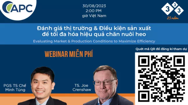 Kính mời quý vị tham dự Hội Thảo online về chủ đề Đánh giá thị trường & Điều kiện sản xuất để tối đa hóa hiệu quả chăn nuôi heo vào ngày 30/8 được tổ chức bởi 333. Thức ăn chăn nuôi chiếm tỷ lệ chi phí cao trong chăn nuôi nên bất kỳ sự biến động nào liên quan tới thức ăn cũng sẽ ảnh hưởng tới kết quả chăn nuôi. Tại sự kiện webinar này, chúng tôi sẽ thảo luận về triển vọng ngành thức ăn chăn nuôi tại Việt Nam, giá cả, nguồn cung và chiến lược để giảm chi phí thức ăn cho heo. Đồng thời, đánh giá ảnh hưởng huyết tương phun sấy trong chế độ ăn đến hiệu quả sử dụng vắc-xin ASF trên heo.