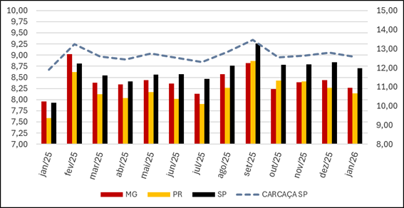 Gráfico 1. Preço médio mensal SUÍNO VIVO em MG, PR E SP (R$/kg), e da carcaça especial em SP, de janeiro/25 a janeiro de 2026 (até dia 20/01/26).