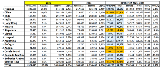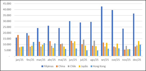 O gráfico 2, a seguir, apresenta a evolução mensal das exportações brasileiras para os 5 principais destino de 2025, demonstrando o crescimento expressivo das Filipinas, a estabilidade do Chile e o encolhimento do mercado chinês.