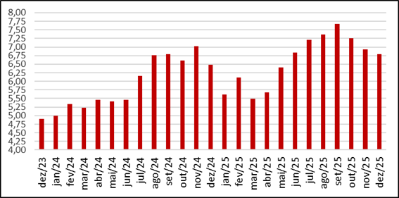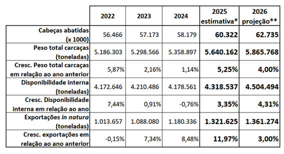 Não somente a carne suína foi destaque no crescimento da exportação, mas também a carne bovina, no segundo semestre de 2025 bateu recordes mensais sucessivos (tabela 4), o que ajudou a escoar o crescimento expressivo do abate de bovinos. A carne de frango que começou 2025 com ritmo de exportação muito bom foi prejudicada pelo foco de Influenza aviária, ocorrido em maio, no RS, mas terminou o ano voltando a crescer, depois que caíram praticamente toda as barreiras sanitárias decorrentes do foco.