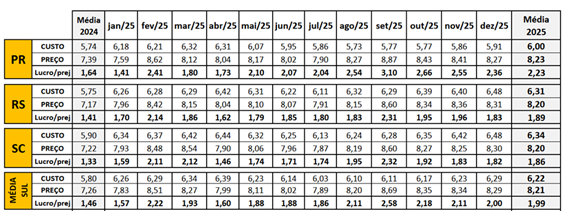 Tabela 6. Custos totais (ciclo completo), preço de venda e lucro/prejuízo estimados, mensais, nos três estados do Sul (R$/kg suíno vivo vendido) de janeiro a dezembro de 2025 e a média anual de 2024.
