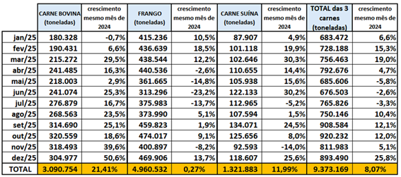 Tabela 4. Exportações brasileiras de carnes in natura bovina, de frango, suína e somatório das três, em toneladas, mês a mês, de janeiro a dezembro de 2025, comparado com o mesmo período de 2024.
