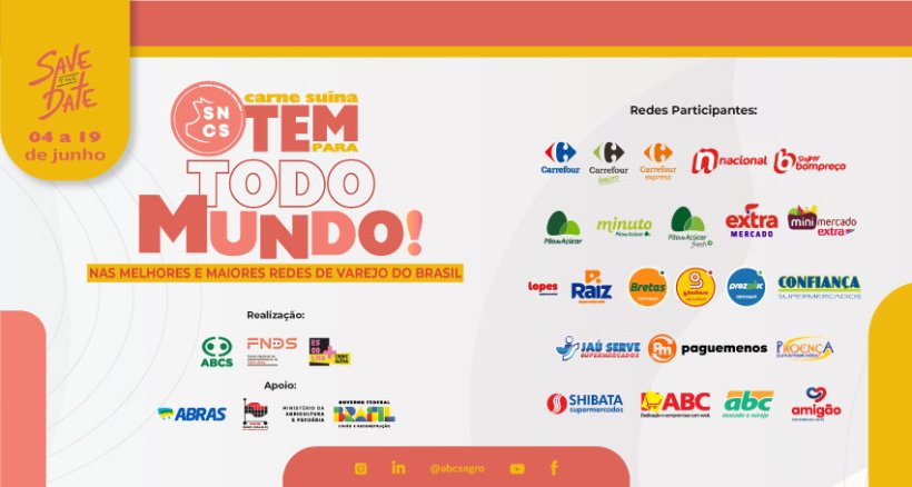 Em sua décima segunda edição, a Semana Nacional da Carne Suína (SNCS) concentra esforços em trabalhar os principais decisores de compra, estabelecendo uma comunicação eficaz entre produtores, varejistas e consumidores. Com a participação de 23 bandeiras do varejo, que representam um quarto do faturamento total do varejo alimentício brasileiro de 2023, a iniciativa da Associação Brasileira dos Criadores de Suínos (ABCS) amplia sua presença no Sudeste e no Nordeste do país, regiões responsáveis por mais de 60% do consumo nacional.