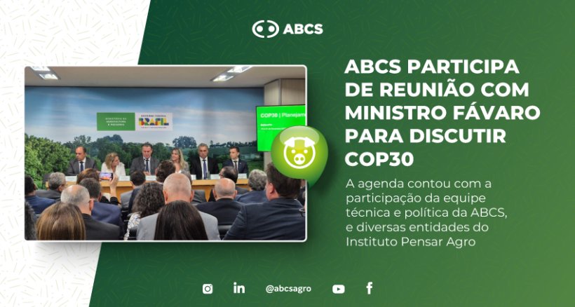 A Associação Brasileira dos Criadores de Suínos (ABCS) participou de reunião com o ministro da Agricultura e Pecuária, Carlos Fávaro, e outras entidades do Instituto Pensar Agropecuária (IPA) para alinhar estratégias em relação à 30ª Conferência das Nações Unidas sobre Mudança do Clima (COP30), que ocorrerá em novembro, em Belém (PA). A agenda ocorreu na última terça-feira (04), na sede da Pasta, em Brasília.