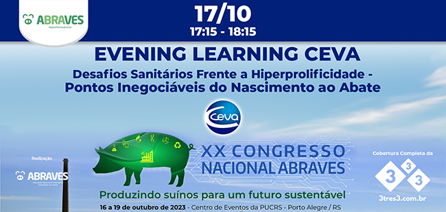 No dia 17 de outubro das 17h15 às 18h15, a CEVA Saúde Animal vai apresentar o Evening Learning, que terá como tema "Desafios sanitários frente a hiperprolificidade - pontos inegociáveis do nascimento ao abate". A palestra será ministrada pelo Anderson Antonio de Queiros, sócio fundador da Atualtech Consultoria e Instrutoria.