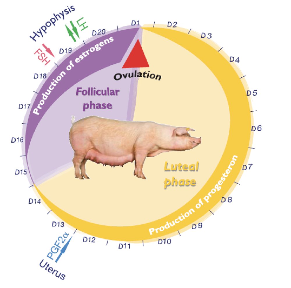 Em um ciclo estral normal, após a liberação da onda do hormônio luteinizante (LH) próximo ao início do estro, os folículos ovarianos maduros liberam seus óvulos (ovulado) e as células restantes da liberação luteinizam para se tornar corpos lúteos. Essas estruturas produzem progesterona e tem um efeito inibitório no lançamento de LH pela hipófise. Como o LH é inibido pela progesterona, os folículos não crescem além do estágio médio, ocorrendo a supressão do crescimento folicular, não ocorrendo o estro. Por volta do décimo quarto dia do ciclo estral, a produção uterina de prostaglandina F2α causa luteólise com a interrupção da produção de progesterona. Este, por sua vez, remove a inibição da secreção de LH e FSH, permitindo a retomada do crescimento folicular à ovulação (Figura 1).