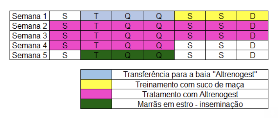 - Iniciar a aplicação de 20 mg de Altrenogest na segunda-feira e manter o tratamento pelos próximos 18 dias. Fornecimento individual para as marrãs às 8:30 h, todas as manhãs.