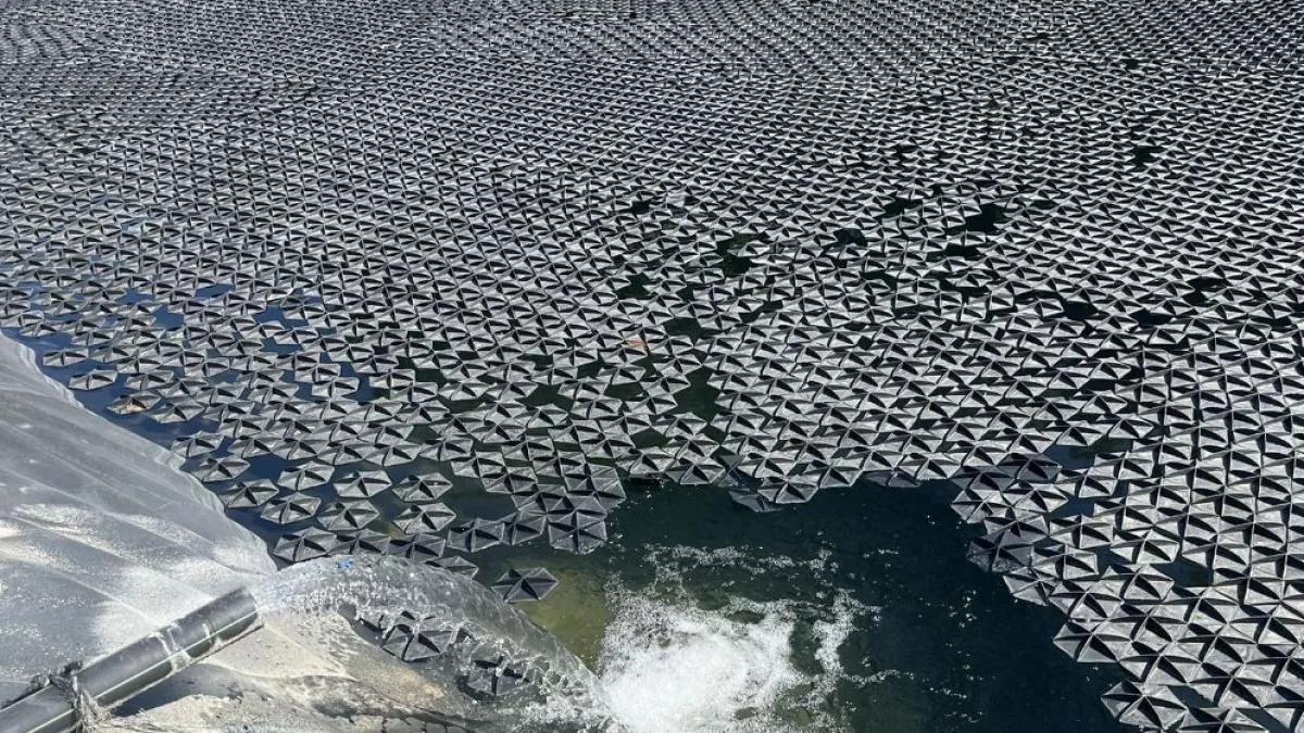 sobre la superficie de la balsa reduce la evaporación del agua de manera extraordinaria, siendo una solución fácil, eficaz y muy recomendable para el ahorro de agua. en estos momento de severa sequía sobre todo el Estado.Además, Hexa-Cover