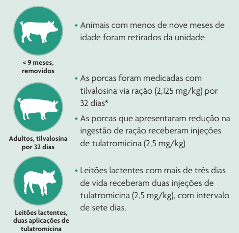 Os antibióticos desempenham um papel crucial na saúde humana e animal. A eliminação de M. hyo permite a redução dos antimicrobianos utilizados na produção suína. Tilvalosina e tulatromicina (antibióticos da categoria C da EMA4) foram utilizadas no estudo, em conformidade com as boas práticas de administração de antibióticos: