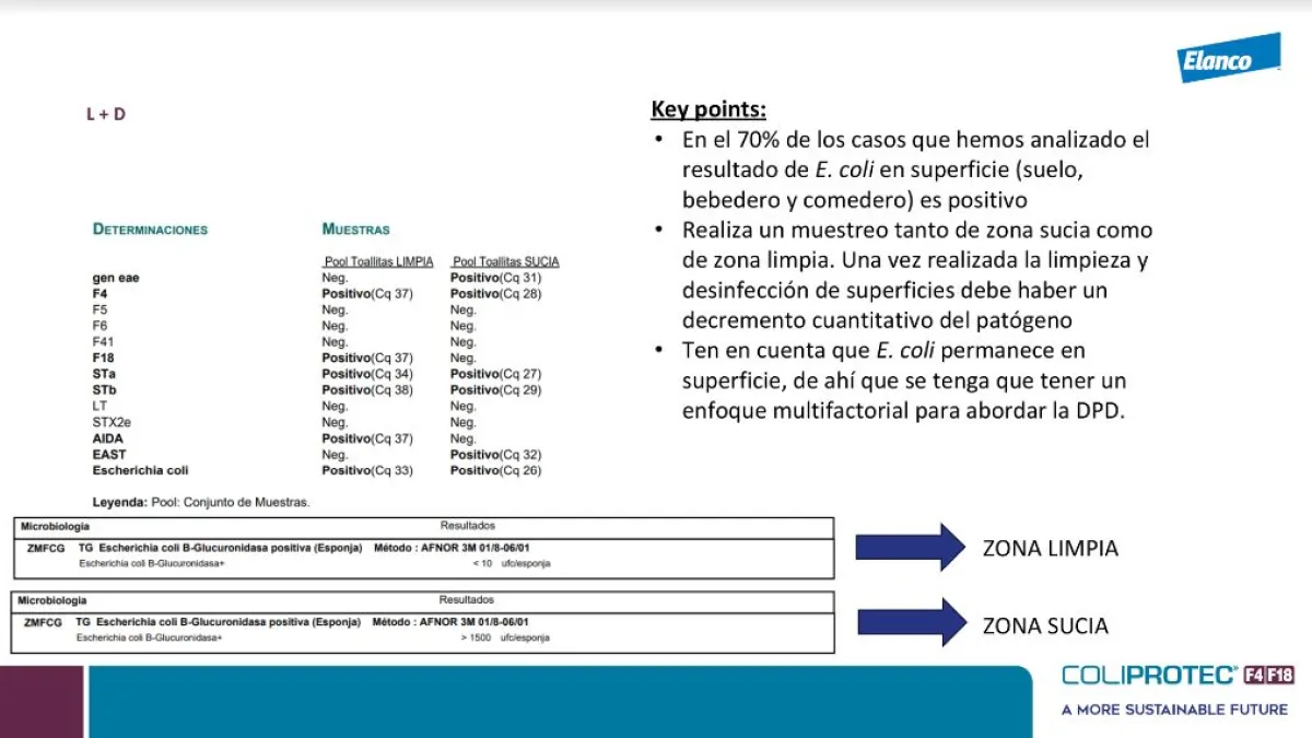 ¿Qué hacemos en nuestra auditoría? Buscar Escherichia coli en superficies (comederos, bebederos y suelo) antes y después de la limpieza y desinfección de las salas. El objetivo es revisar la reducción de su presencia a través de UFC/esponja o con PCR cuantitativa.