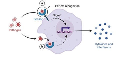 A interação entre receptores e PAMP guarda semelhança com a complementaridade entre antígeno e anticorpo (imunidade adquirida). Porém, no caso das respostas inatas, não há diversidade nem capacidade adaptativa para novos receptores ou novos padrões moleculares além daqueles já programados no código genético (Cruvinel et al. 2010). No caso dos PAMP, os receptores de reconhecimento de padrões evoluíram para identificar estruturas que são geralmente essenciais para a sobrevivência e infectividade dos microrganismos, ou seja, que normalmente são conservadas evolutivamente. Dessa forma, os patógenos seguem sendo reconhecidos mesmo após mutações ou quando não expressam seus alvos de reconhecimento.