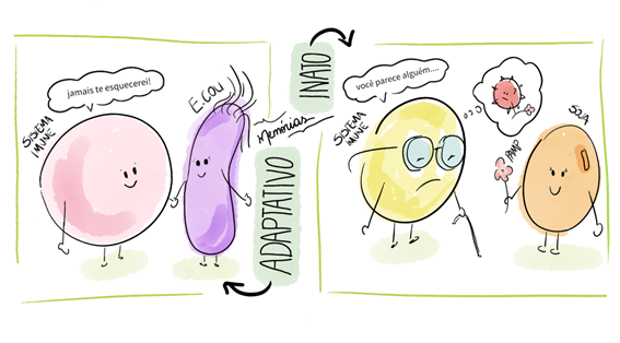 A resposta imune adquirida possui especificidade e diversidade de reconhecimento, memória, especialização de resposta, autolimitação e tolerância a componentes do próprio organismo. Por outro lado, a ação do sistema imunológico inato independe de estímulo prévio e normalmente sua resposta será a mesma em encontros repetidos com um patógeno (sem memória). Isso acontece porque o sistema reconhece estruturas que são comuns a diversas classes de microrganismos e que não estão presentes nas células normais do hospedeiro. Este reconhecimento é realizado pelos ‘receptores de reconhecimento de padrões’ localizados nas membranas e no interior das células (Figura 1). As moléculas capazes de ativar a imunidade inata são chamadas de ‘padrões moleculares associados ao patógeno’ (PAMP, do inglês, pathogen-associated molecular patterns). Além delas, moléculas expressas por células danificadas do hospedeiro (DAMP) também podem ser reconhecidas pelo sistema inato. Neste último caso, conteúdo mitocondrial ou fragmentos de DNA e RNA podem ser reconhecidos como indicativos de que houve danos às células do indivíduo.