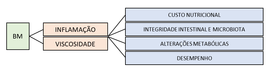 O prejuízo no aproveitamento dos nutrientes pode ser agravado ainda mais no caso específico da ativação de resposta imune por BM, pois estas substâncias atuam diretamente sobre a absorção de nutrientes (Kipper et al. 2020). Os BM são considerados fatores antinutricionais importantes, frequentemente relacionados com piora na viscosidade e aproveitamento nos nutrientes.