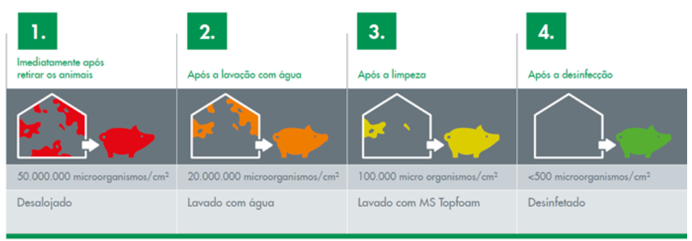 O raciocínio é simples de entender: é impossível desinfetar um ambiente sujo. O ambiente de uma baia com dejetos e resíduos de alimentos possui uma alta carga microbiológica e grande quantidade de matéria orgânica acumulada. A limpeza com detergente alcalino tem o objetivo de emulsificar (“dissolver”) essa gordura, proteína e resíduos acumulados, de forma que eles possam ser removidos durante o enxágue. Esse processo de limpeza, quando feito corretamente, remove até 98% da contaminação ambiental, como ilustrado no esquema abaixo:
