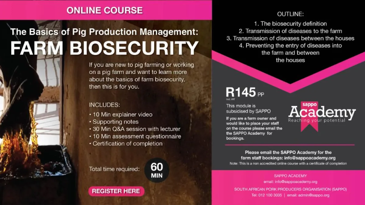 SAPPO Academy is an organisation that focuses on pig production training. The academy mandate is to promote animal, environmental and public health in the pig industry by influencing the behavior of people through knowledge transfer. The training is aimed at aspiring pig farmers, developing pig farmers, smallholder pig farmers, university students, government, and non-government officials, and any other person interested in pig farming.
