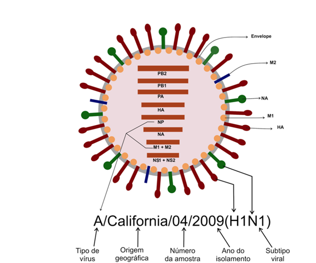 O vírus influenza A (VIA) é pertencente à família Orthomyxoviridae, sendo envelopado e, portanto, suscetível a desinfetantes, antivirais e detergentes que normalmente são utilizados em granjas. Os VIA podem ser classificados ainda em diferentes subtipos virais, em que estes são caracterizados de acordo com as glicoproteínas localizadas no envelope viral, a hemaglutinina (HA) e a neuraminidase (NA), sendo estas estruturas os principais alvos para o sistema imune. Atualmente são descritos 18 tipos de HA e 11 tipos de NA (RAJÃO et al., 2019).