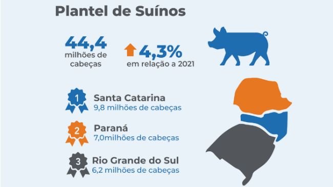No ranking das UFs, Santa Catarina continua liderando o abate de suínos, com 29,9% da participação nacional, seguido por Paraná (21,4%) e Rio Grande do Sul (16,7%).