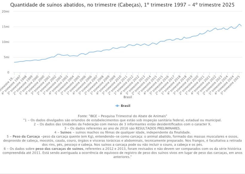 O abate de suínos no Brasil atingiu o recorde histórico de 60,69 milhões de cabeças em 2025, o que representa um aumento de 4,3% (2,51 milhões de cabeças) em relação ao ano anterior. Os dados constam nos resultados completos da Pesquisa Trimestral do Abate de Animais, divulgados nesta quinta-feira (18) pelo Instituto Brasileiro de Geografia e Estatística (IBGE). O resultado, o maior da série histórica iniciada em 1997, foi impulsionado pelo volume recorde de exportações e pela redução dos custos de produção no país ao longo do ano.