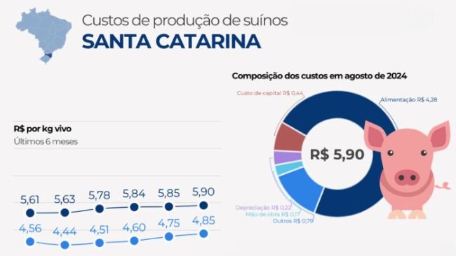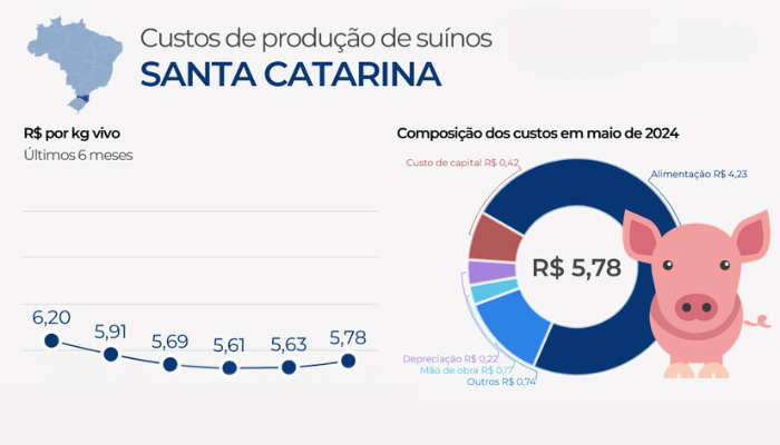 O custo de produção do quilo de suíno vivo em Santa Catarina, o alcançou R$ 5,78, um aumento de +2,69% em comparação a abril, mas ainda com uma queda acumulada no ano (-6,87%) e nos últimos 12 meses (-0,83%), com o ICPSuíno atingindo 330,50 pontos. Os custos com rações e juros sobre o capital investido e de giro foram determinantes, com aumentos de +3,29% e +3,37%, respectivamente.