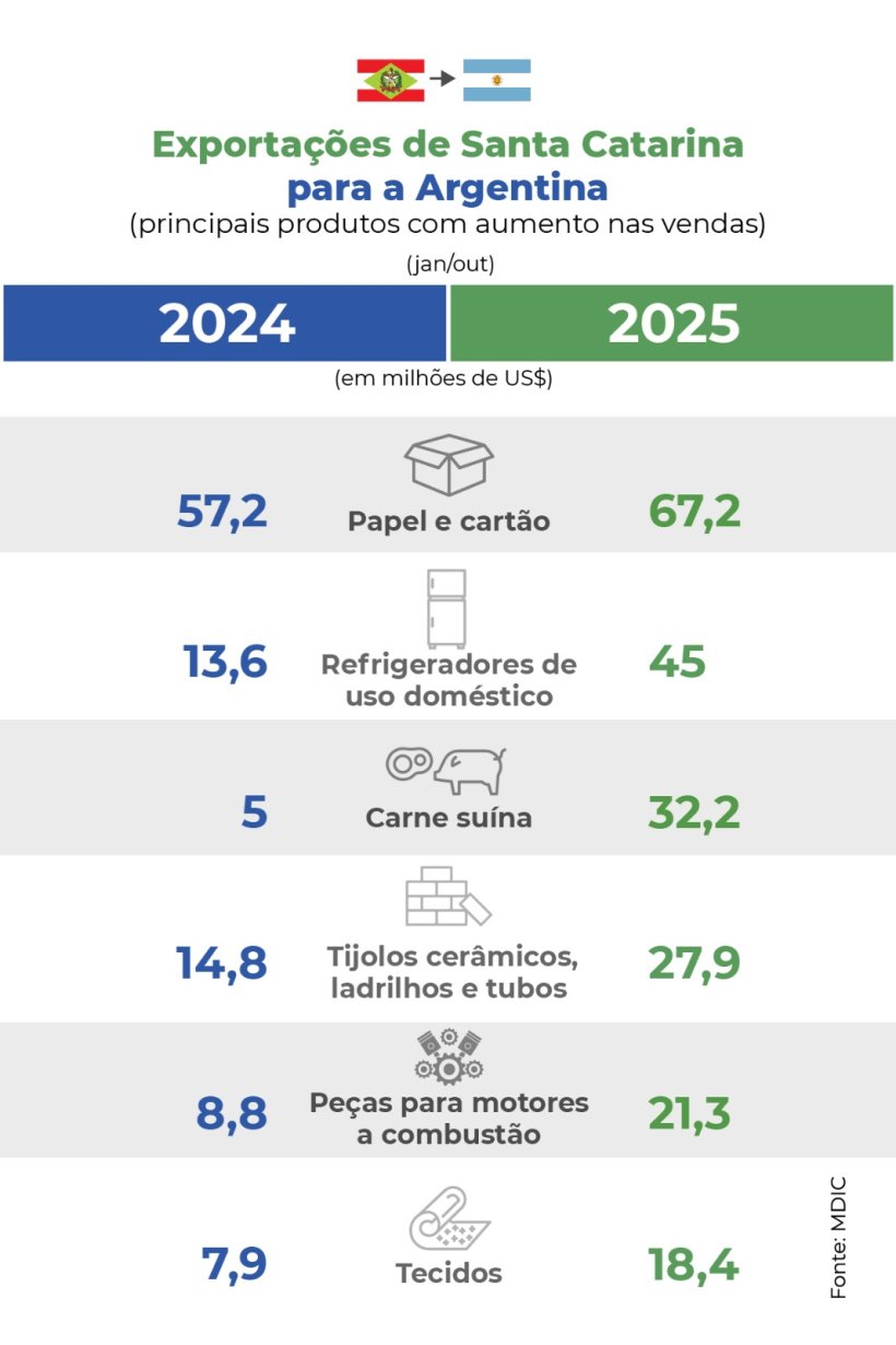 O percentual de 25% corresponde ao salto de US$ 595 milhões exportados entre janeiro e outubro de 2024 para US$ US$ 746 milhões exportados em 2025. A ampliação expressiva ajudou o estado a bater recorde de exportações em 2025 e compensar a queda nos envios para outros países. O bom resultado também demonstra, portanto, o aumento das relações comerciais entre Santa Catarina e a Argentina.