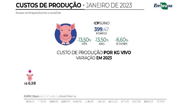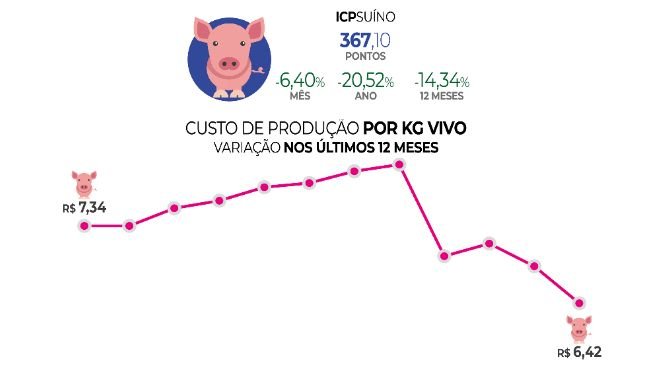 O custo de produção de suínos voltou a cair no mês de junho segundo os estudos mensais da Central de Inteligência de Aves e Suínos (CIAS) da Embrapa Suínos e Aves. O ICPSuíno foi de -1,11% no mês de junho em relação a maio, fechando em 329,58 pontos.