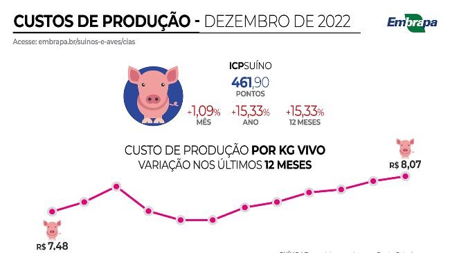Os custos de produção de suínos tiveram redução no mês de agosto segundo os estudos mensais da Central de Inteligência de Aves e Suínos (CIAS) da Embrapa Suínos e Aves. A variação do ICPSuíno foi de -0,71%, encerrando o mês de agosto em 332,67 pontos.