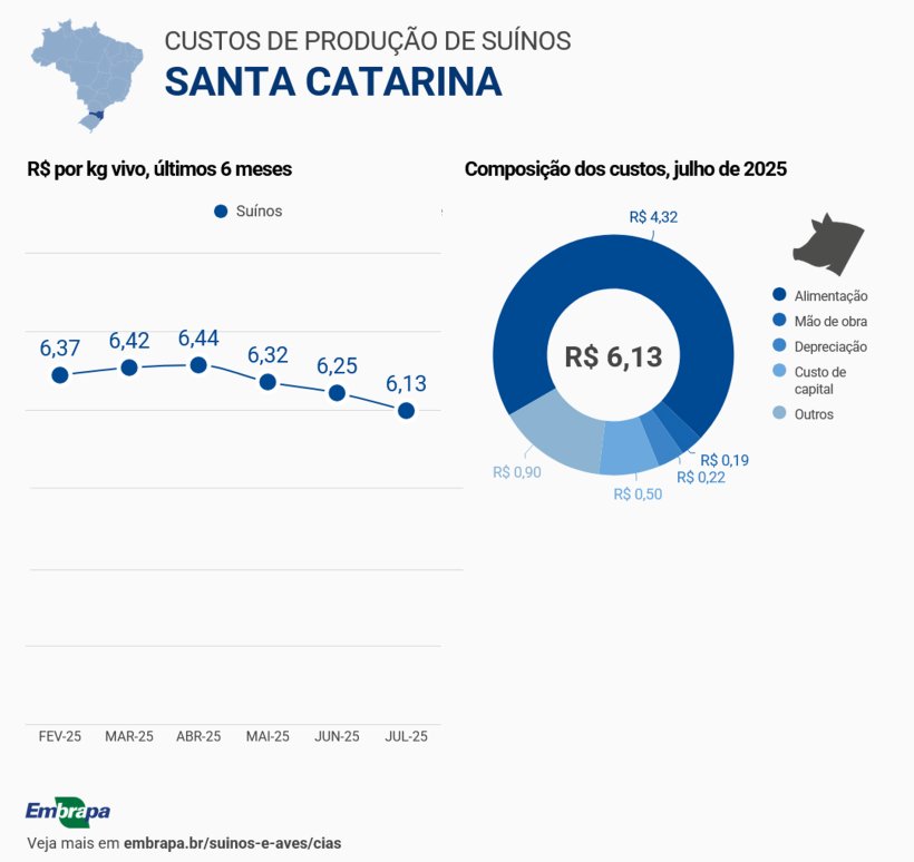 Em Santa Catarina, o custo de produção do quilo do suíno vivo recuou para R$ 6,13, representando uma redução de 2% em relação ao mês anterior e o menor valor desde setembro de 2024. No acumulado de 2025, o ICPSuíno registra redução de 1,28%, e, nos últimos 12 meses, alta de 4,78%, com o índice atingindo 350,55 pontos em julho. A ração, que respondeu por 70,48% do custo total de produção de suínos na modalidade de ciclo completo, também teve retração: -2,81% no mês.