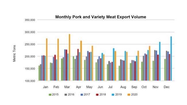 No primeiro semestre do ano, as exportações representaram 31,5% da produção total de carne suína. O valor das exportações por cabeça abatida foi em média $ 46,19 em junho, queda de 19% em relação ao ano anterior e uma queda acentuada em relação aos altos níveis alcançados em abril e maio. A média de janeiro a junho foi de US$ 63,61 por cabeça, um aumento de 27% em relação ao ano anterior.