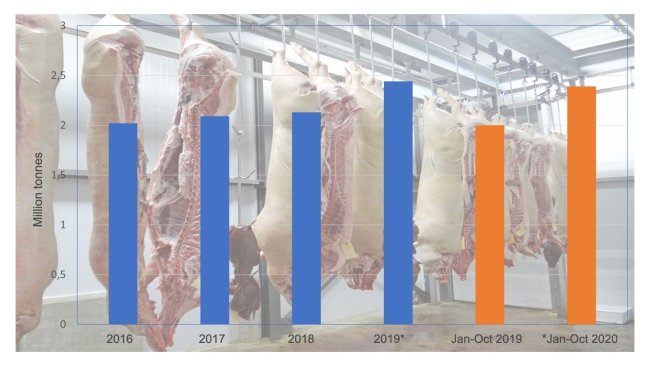 As exportações espanholas de carne suína e seus derivados continuam imparáveis, com um aumento de 19% entre janeiro e outubro de 2020.