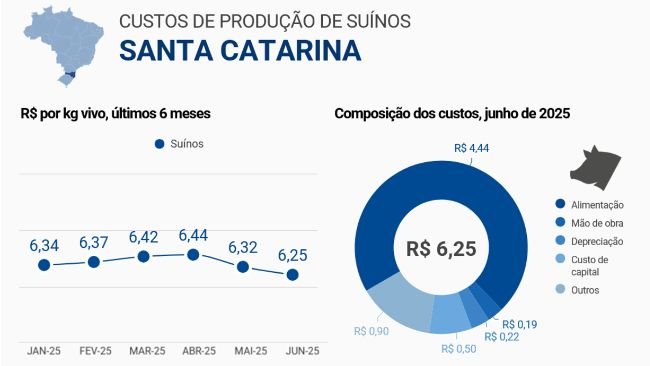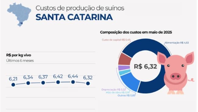 Os custos de produção de suínos caíram pelo segundo mês seguido em junho de 2025, segundo a Embrapa Suínos e Aves (CIAS). Em Santa Catarina, o quilo do suíno vivo chegou ao menor valor do ano: R$ 6,25.