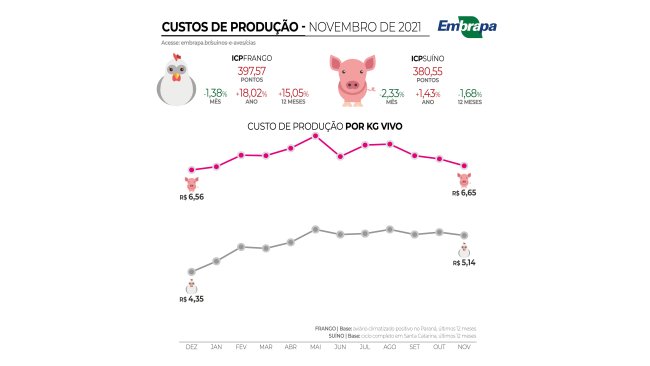 Os custos de produção de frangos de corte e de suínos recuaram em novembro segundo os estudos publicados pela CIAS- Embrapa Suínos e Aves.