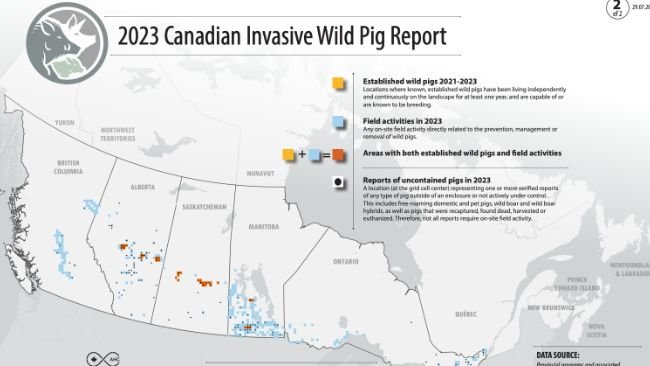O relatório mapeia as localizações de javalis selvagens e as atividades provinciais de prevenção, manejo e remoção.